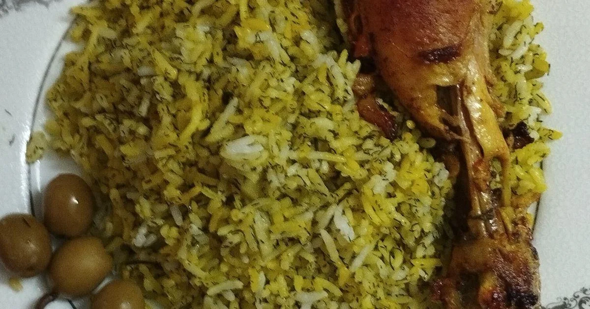 Add oil to the bottom of a clean pot. Layer in some rice, then add dried dill and cooked beans. Repeat the layers until all the rice, dill, and beans are used, finishing with rice on top. Drizzle brewed saffron over the rice.