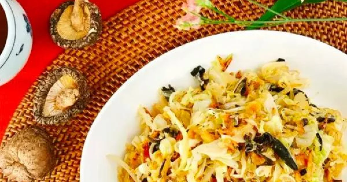 Heat the sesame oil in a large frying pan over medium heat. Add the sliced garlic, sakura shrimp, and soaked wood ear mushrooms, then stir-fry until fragrant.