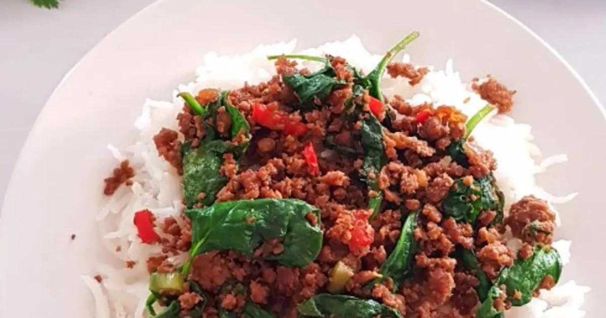 Add the minced meat and cook, breaking it up with a spatula, until lightly browned and cooked through. Stir in the dark soy sauce, fish sauce, sugar, and a splash of water if the mixture looks dry. Add the baby spinach, chopped spring onion, and deseeded red chili, then toss just until the spinach wilts. Season with ground pepper and salt or chicken seasoning powder to taste. Serve hot with white rice, or use as a filling for wraps or tortillas.