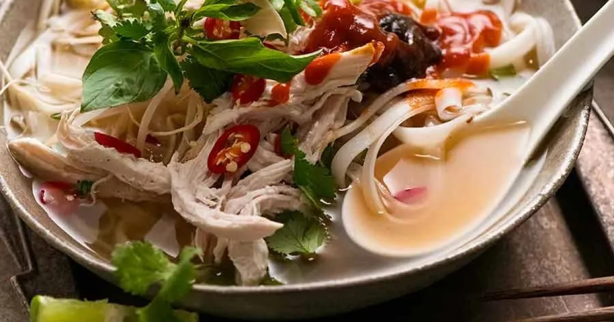 If needed, briefly warm the shredded chicken by dipping it into the hot broth. Divide the noodles among serving bowls and top with the chicken.