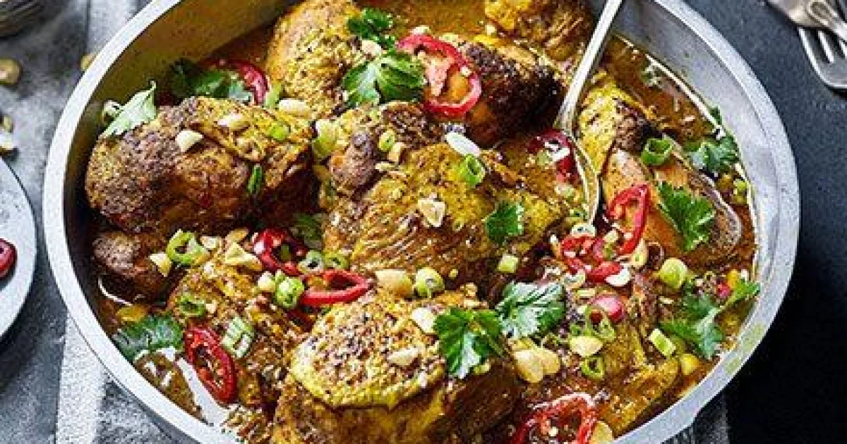This rich peanut butter chicken curry is deeply savory, gently spiced, and balanced with fresh lime, lemongrass, and coconut milk. Tender chicken simmers in a fragrant sauce until succulent, then gets finished with herbs, peanuts, and chili for a bold, comforting dinner.