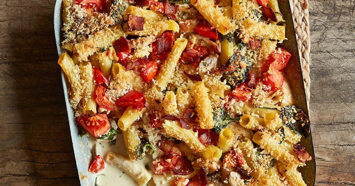 This creamy chicken Alfredo pasta bake is loaded with tender chicken, crispy bacon, spinach, and plenty of Parmesan. Finished with a crunchy breadcrumb topping, it is a comforting family dinner that is also great for making ahead.
