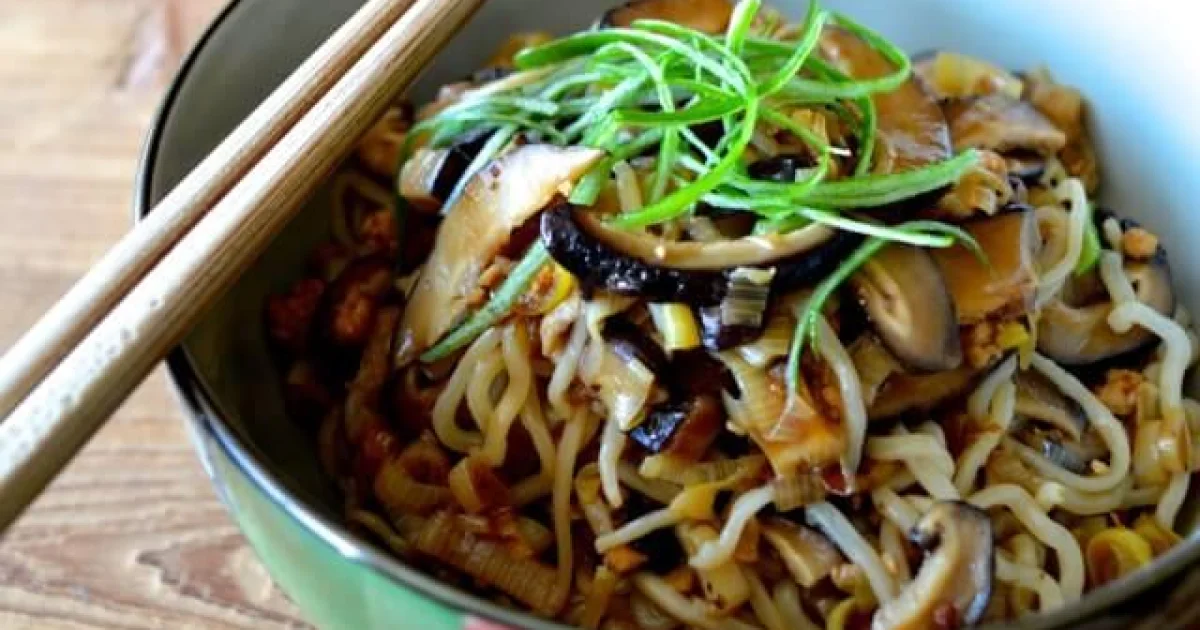 This savory mushroom pork noodle stir-fry is packed with umami from dried shiitake mushrooms, soy sauce, and Shaoxing wine. Tender noodles soak up the glossy sauce, making this an easy, satisfying dinner for busy weeknights.