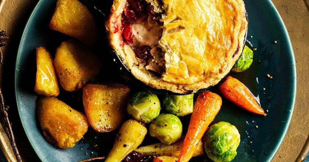 This festive chicken pie combines a crisp sage pastry crust with juicy chicken, savory sausage, and sweet cranberry sauce. Served with roast potatoes, Brussels sprouts, carrots, and parsnips, it makes a cozy holiday dinner that feels special without being overly complicated.
