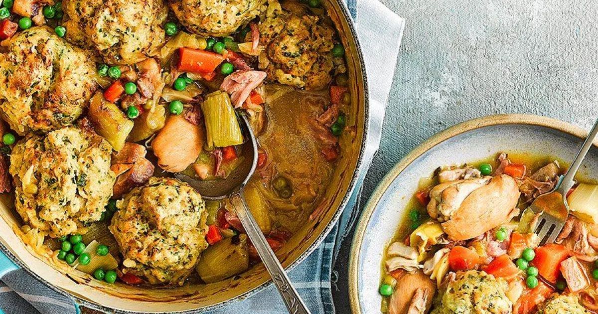 Arrange the dumplings on top of the casserole. Cover and bake for 30 minutes, then remove the lid and bake for 10 minutes more, until the dumplings are puffed and golden. Serve hot in deep bowls.