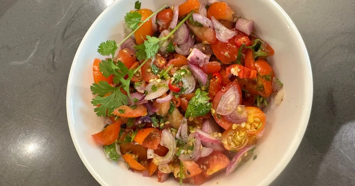 Finely dice the cherry tomatoes and red onion. Thinly slice the chilies, finely chop the cilantro, and mince the garlic if using.